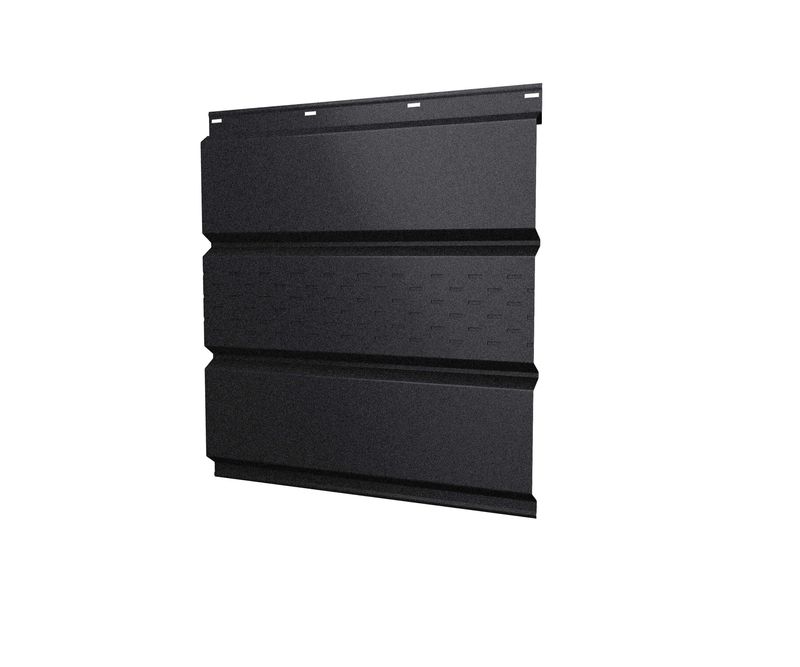 Софит металлический с центральной перфорацией 0,45 РЕ с пленкой RAL 9005 черного цвета - это качественный и стильный элемент отделки фасада здания. Изготовлен из металла, что обеспечивает ему прочность и долговечность. Центральная перфорация добавляет декоративность и позволяет воздуху свободно циркулировать, предотвращая скопление влаги и возникновение плесени. Пленка RAL 9005 черного цвета придает софиту элегантный и современный вид, а также защищает его от воздействия внешних факторов, таких как солнечные лучи и атмосферные осадки. Этот софит идеально подходит для использования на фасадах жилых и коммерческих зданий, создавая эстетически привлекательный и функциональный облик.